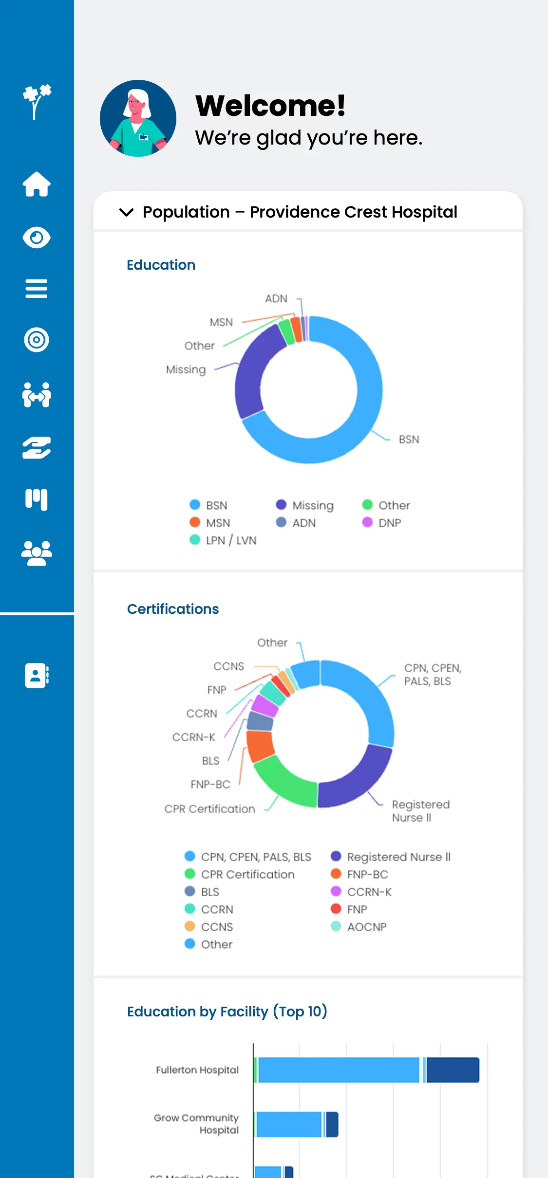 StaffGarden provides role based dashboards and Magnet® reports that give Magnet® teams, NPD leaders, and executives audit ready visibility into credentials, certifications, flagged exemplars, mentorship participation, evidence based projects, and professional development and peer review program engagement. Reporting can be viewed and filtered at the system, facility, department, service line, manager, or individual level—supporting audits, executive updates, and accreditation preparation without manual effort. Specialized DDCT reporting is also available, mapping organizational data to submission ready Magnet® formatting and category requirements. Magnet® reporting is purpose built for compliance, particularly around required demographic and workforce data.